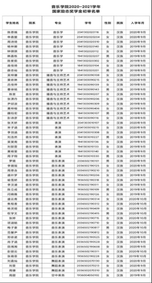 音乐学院2021-2022学年国家励志奖学金初审名单