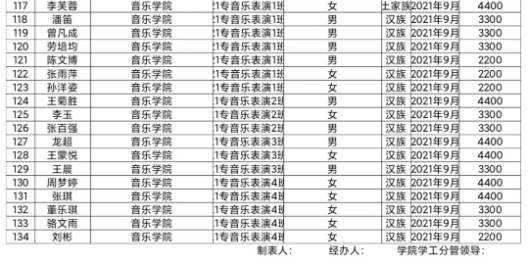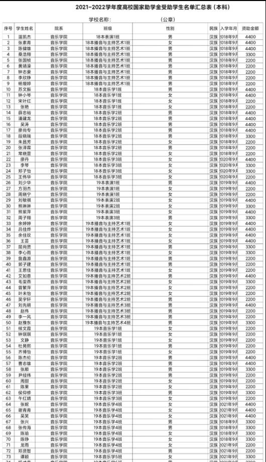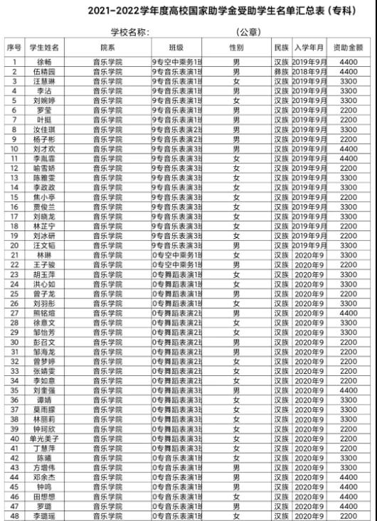 为切实做好我校2021-2022学年国家助学金的评审工作,根据学生资助管理中心《关于做好2021年度高校本专科生国家奖助学金评审及资金发放工作的通知》(赣助中心〔2021〕17号)和《江西应用科技学院国家助学金评审办法》(应科院资助字【2021】5号)文件精神及我校奖助学金的有关政策规定,经学生本人申请,民主评选,班级推荐,音乐学院奖助学金评审工作小组讨论初审等程序,拟推荐薛忠裕等295名学生为我院2021-2022学年国家助学金受助学生,95名评定为一等助学金,105名评定为二等助学金,95名评定为三等助学金。现向全院师生予以公示。(后附:2021-2022学年国家助学金受助学生名单汇总表)