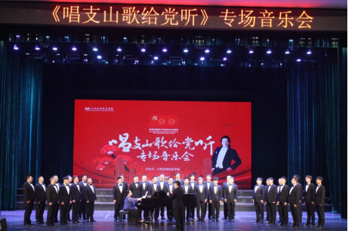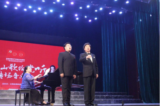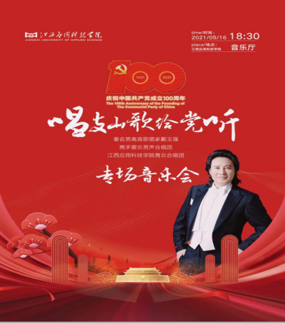 唱经典,学党史、知党情。为庆祝中国共产党成立100周年,促进北京大学歌剧研究院与江西应用科技学院的合作,提高我院歌剧中心的专业面貌。2021年5月16日晚18:30我院特别邀请北京大学歌剧研究院教授、著名男高音歌唱家戴玉强教授携手中国爱乐男声合唱团、江西应用科技学院青云合唱团在音乐厅深情演绎“唱支山歌给党听——江西应用科技学院庆祝中国共产党成立100周年”专场音乐会!活动现场,学校师生齐唱《唱支山歌给党听》《我的祖国》,讴歌党的丰功伟绩,抒发爱党爱国情怀,奏响党史学习教育“大合唱”。此次音乐会采用现场、直播相结合的方式,为大家带来一场视觉盛宴,观看直播人数突破百万人次。