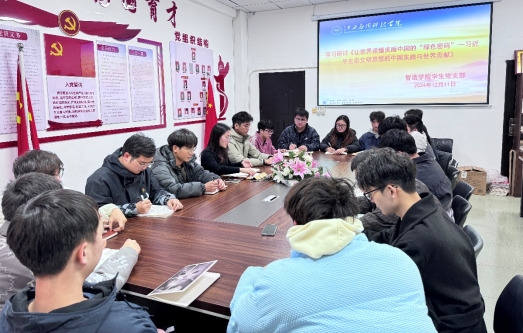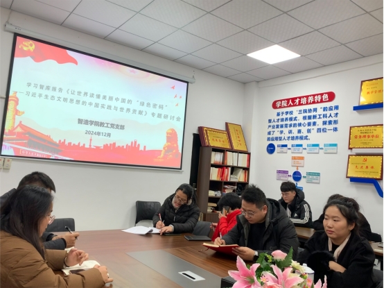 2024年12月10日和12月11日,智造学院教工党支部、学生党支部分别在智造中心204B党员活动室组织学习智库报告《让世界读懂美丽中国的“绿色密码”——习近平生态文明思想的中国实践与世界贡献》专题研讨会。
